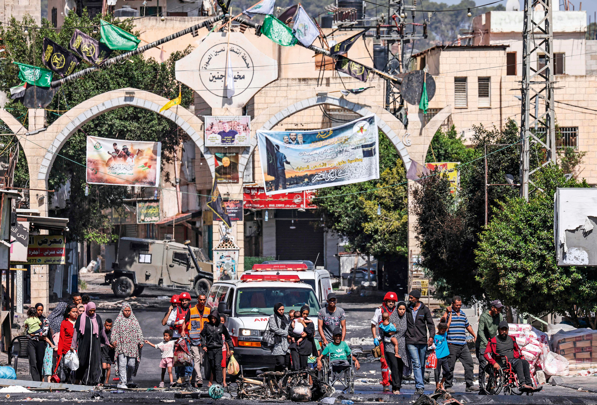 Persone in fuga dal campo profughi di Jenin, in Cisgiordania, durante un’operazione militare dell’esercito israeliano. Nell’incursione, la più grande degli ultimi anni, durata dalla notte del 3 alla mattina del 5 luglio, sono morti dodici palestinesi e un soldato israeliano. Nel campo di Jenin vivono 14mila persone e in tremila hanno lasciato le loro case per sfuggire ai combattimenti. L’esercito israeliano ha usato droni ed elicotteri, come aveva fatto in un precedente attacco alla fine di giugno, per la prima volta dal 2006.