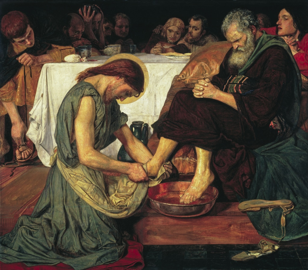 Gesù lava i piedi di Pietro (1852-1856) è un altro azzardo iconografico: il punto centrale del quadro sono i piedi nudi di San Pietro che vengono asciugati da Gesù, intento nel suo lavoro a capo chino, come un operaio. Nella versione originale del dipinto Gesù era a torso nudo, per sottolineare l’aspetto fisico della lavanda dei piedi ma Madox Brown ha dovuto coprirlo per poter vendere il quadro. La nudità esibita dei piedi maschili (quelli di Pietro in primo piano, con tanto di sandali buttati alla sua destra e quelli di Giuda sinistra che si sta slacciando i calzari) ha accenti feticistici che solo un artista vittoriano poteva rendere. Per rendere più esplicita la sua scena e non distrarre lo spettatore, Madox Brown rifiuta la prospettiva rinascimentale e risucchia lo spazio intorno alla scena, con un procedimento prospettico inverso a quello dei grandi quadri scenografici del Veronese.
