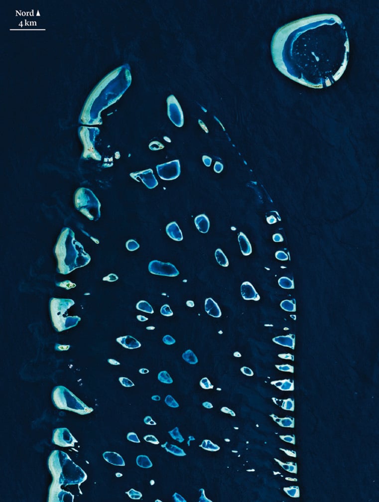 Quest’immagine, scattata da un satellite della missione Sentinel-2 dell’Esa, mostra la parte settentrionale dell’atollo Ari. Lungo 90 chilometri e largo 30, è uno dei più grandi delle Maldive. È composto da 82 isole, 18 delle quali abitate. Il colore turchese indica la presenza di acque limpide e poco profonde, che contrastano con quelle più scure e profonde dell’oceano Indiano.