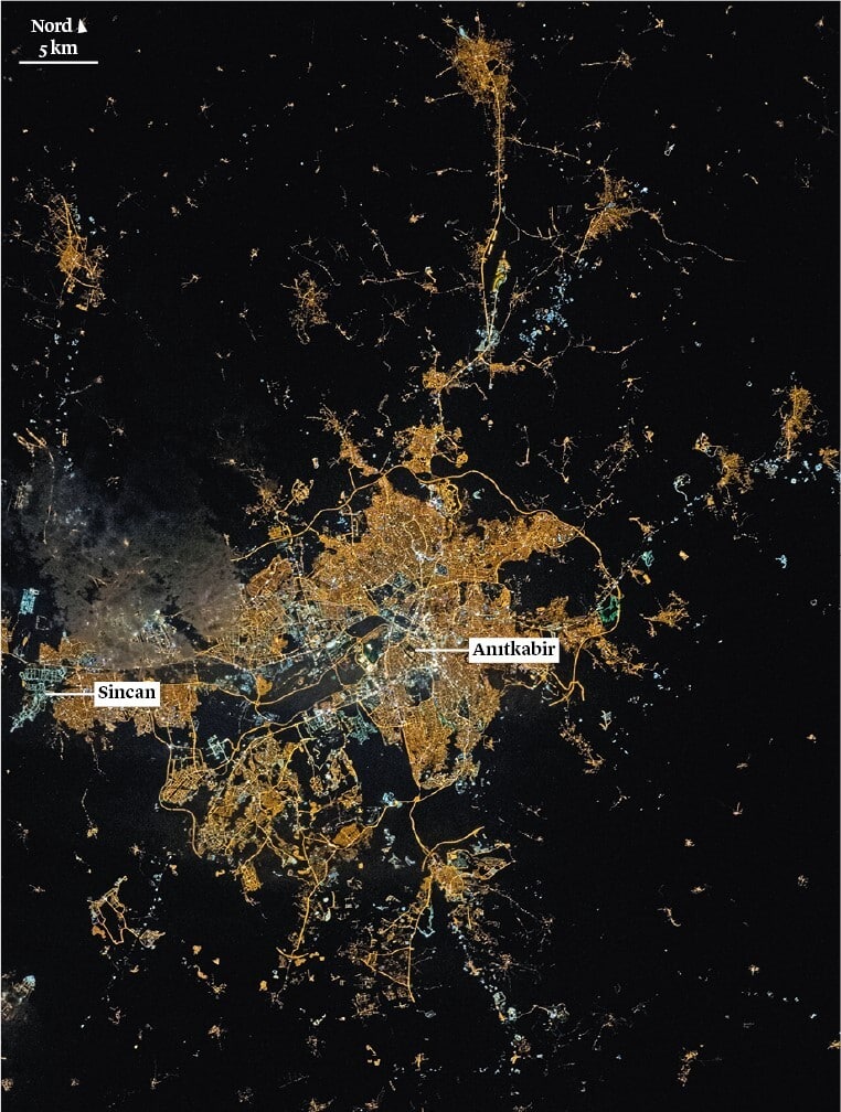Nell’immagine spiccano i colori delle luci di Ankara: il giallo-arancione, più diffuso, e il bianco. Le due tonalità dipendono dall’uso di diversi sistemi d’illuminazione, che in linea di massima distinguono le aree residenziali da quelle industriali della città. L’area industriale di Sincan, per esempio, emette una forte luce bianca, mentre i lampioni danno una luce più calda ai quartieri residenziali, in cui durante il giorno predomina il rosso dei tetti delle case.