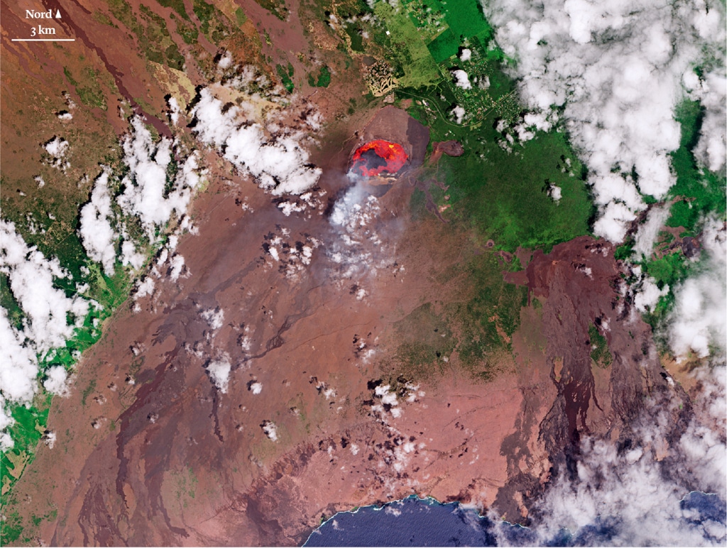 ◆L’arcipelago delle Hawaii, formato dall’affioramento del magma in un punto caldo al centro dell’oceano Pacifico, contiene alcuni dei vulcani attivi più grandi del mondo. Uno di questi è il Kilauea, sul versante sudorientale dell’isola di Hawaii. Questa immagine, acquisita il 3 settembre 2025, mostra un lago di lava lungo circa 2,5 chilometri nel cratere principale, formato il giorno prima da un’eruzione che ha creato fontane di roccia fusa alte fino a cento metri. Dal cratere continua a salire un pennacchio di fumo di colore chiaro.
