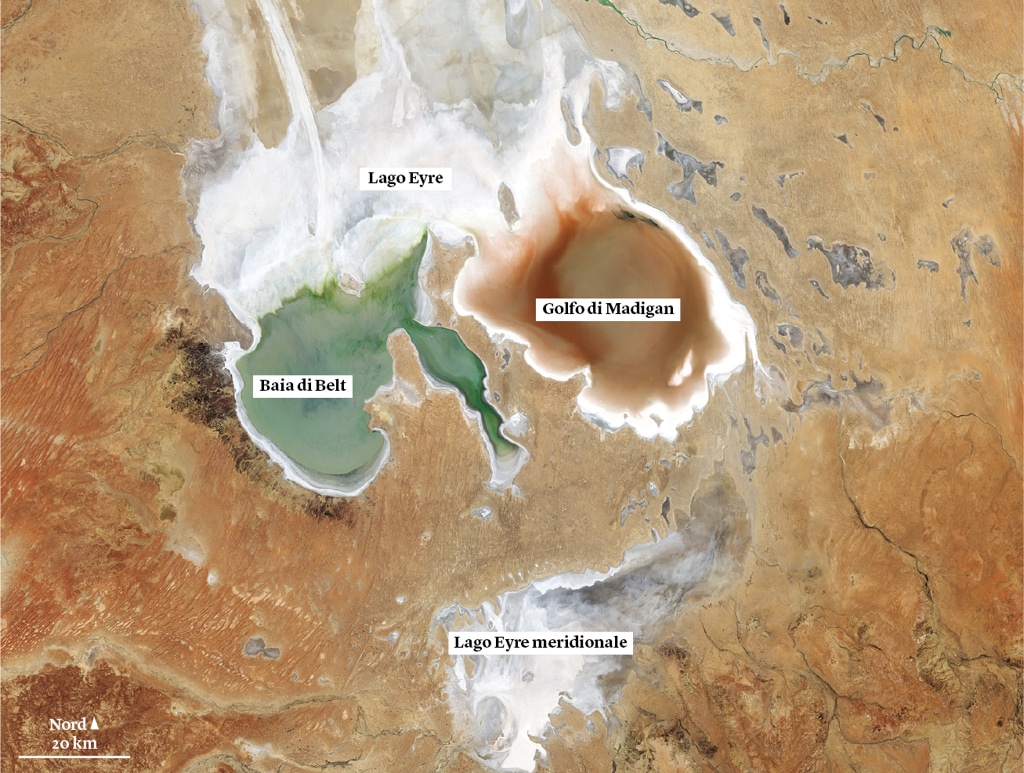 ◆ Il 2025 è stato un anno straordinario per il lago Eyre, nel sud dell’Australia. L’acqua ha ricominciato a scorrere nel suo letto asciutto all’inizio di maggio, dopo che le piogge torrenziali nel Queensland avevano riempito i suoi immissari, e ha continuato a salire nei mesi successivi, raggiungendo livelli insolitamente alti.