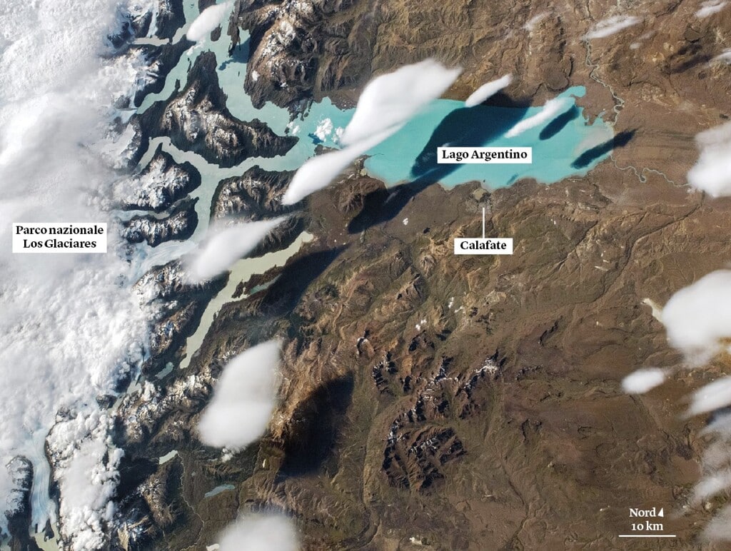 ◆ In questa foto scattata da un astronauta a bordo della stazione spaziale internazionale, un gruppo di nuvole a forma di pesce sorvola le acque del lago Argentino, in Patagonia.