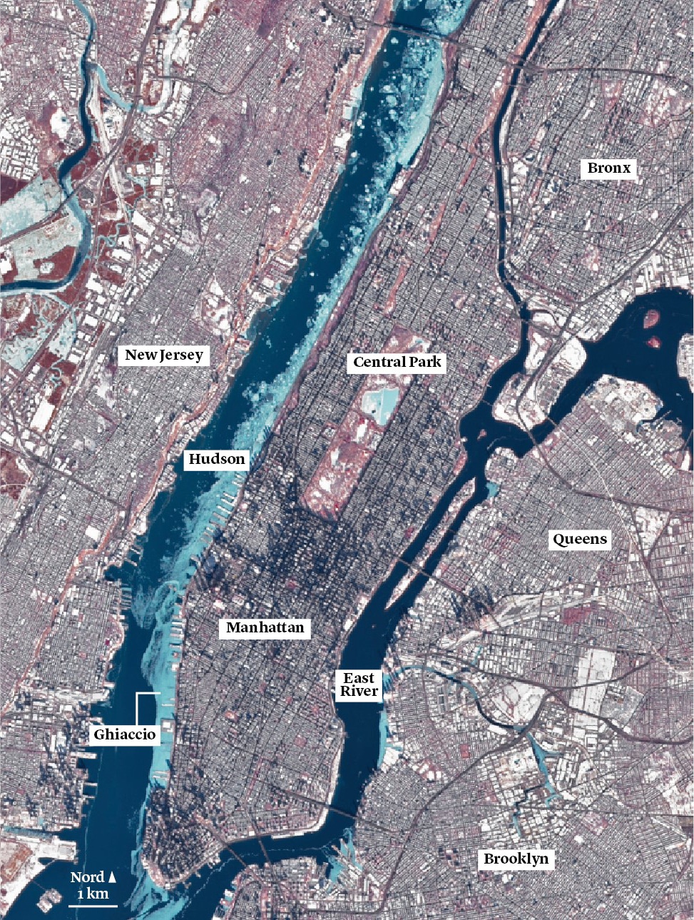In questa immagine dai colori artificiali, realizzata intorno a mezzogiorno del 28 gennaio dal satellite Landsat 8, il ghiaccio (azzurro chiaro) appare abbondante nel fiume Hudson sulla riva occidentale di Manhattan, ed è visibile in quantità minori nell’East River, nel bacino idrico di Central park e nei corsi d’acqua del New Jersey. La vegetazione è di colore rosso.