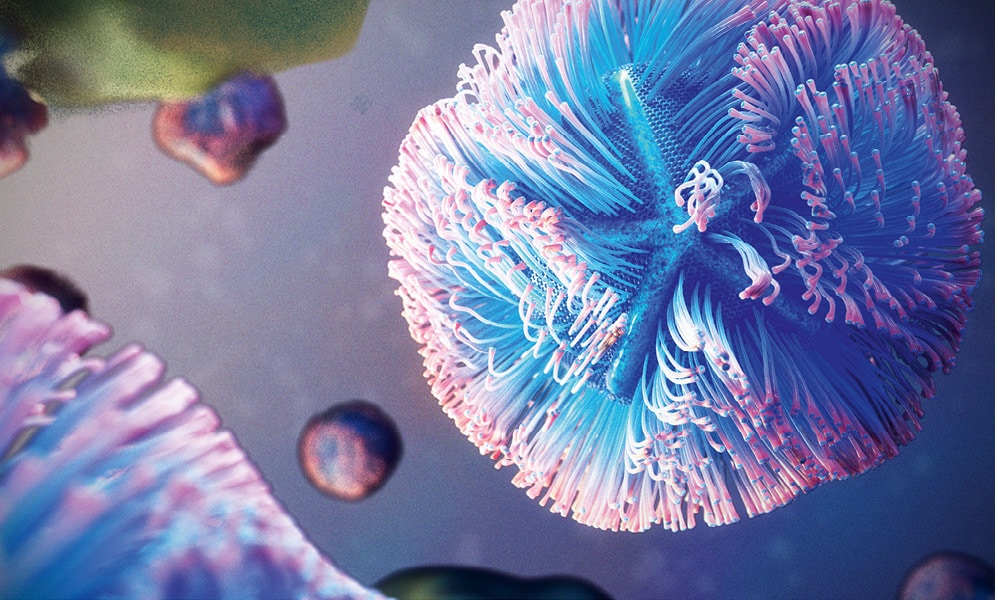 Uno studio pubblicato su Cell descrive come l’Acanthamoeba polyphaga mimivirus (nell’immagine), un virus a dna di grandi dimensioni, prende il controllo dei ribosomi della cellula infettata monopolizzando a proprio vantaggio la produzione di proteine. Senza questo meccanismo, la replicazione del virus rallenta fino a centomila volte. La scoperta conferma che certi virus dispongono di strumenti molecolari sofisticati capaci di sostituire alcune funzioni cellulari, contraddicendo la tesi secondo cui sono solo dei parassiti.