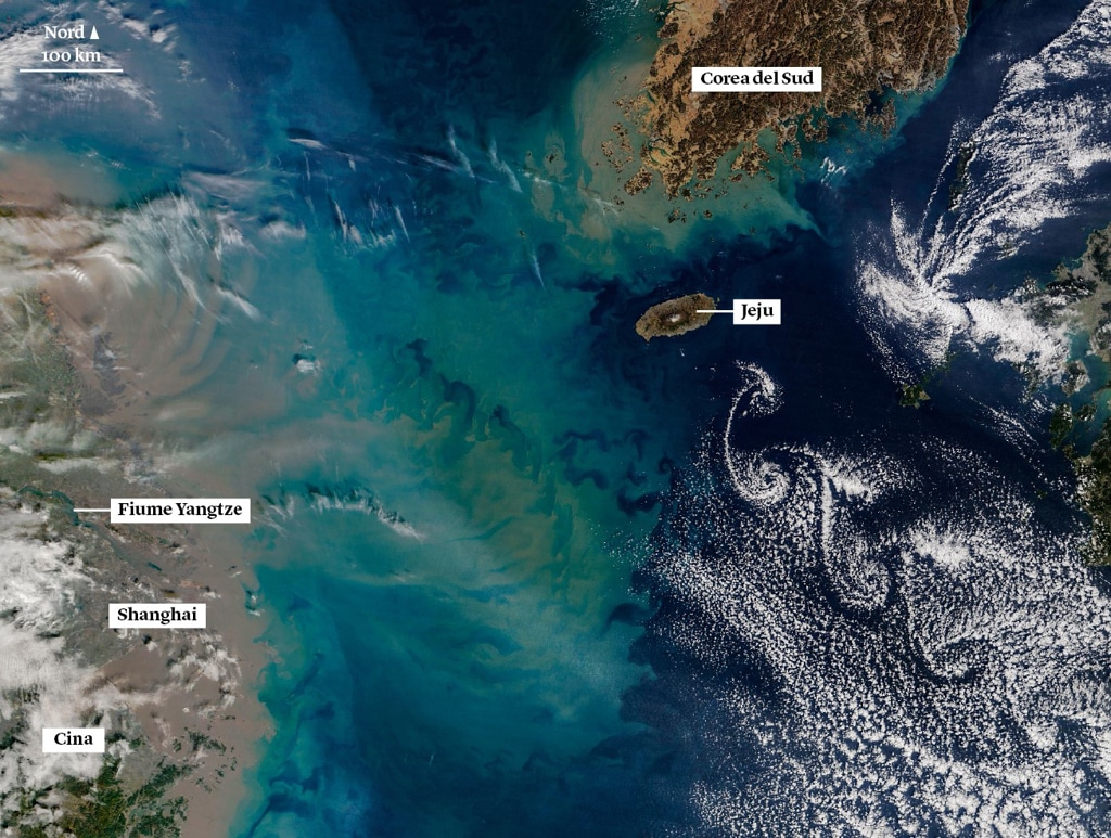 Al momento dello scatto anche il mare intorno a Jeju era agitato. A ovest dell’isola è visibile un ampio pennacchio di sedimenti provenienti dalla costa del Jiangsu, in Cina. Anche se le acque poco profonde della zona sono torbide tutto l’anno, pennacchi così estesi sono frequenti soprattutto in inverno, probabilmente a causa delle variazioni stagionali delle correnti e al mescolamento verticale della colonna d’acqua.–Nasa