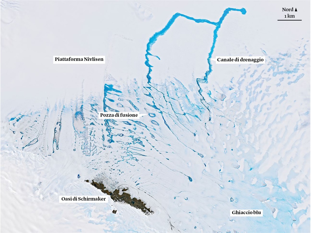 Le chiazze di ghiaccio blu intorno all’oasi sono zone prive di neve dove il ghiaccio vecchio, compresso e senza bolle d’aria, è stato portato allo scoperto dai venti catabatici e dalla sublimazione (il passaggio diretto dallo stato solido a quello gassoso). Questo ghiaccio denso assorbe le frequenze rosse della luce e riflette quelle blu. Il ghiaccio blu è raro in Antartide, e copre circa l’1 per cento della superficie del continente.
