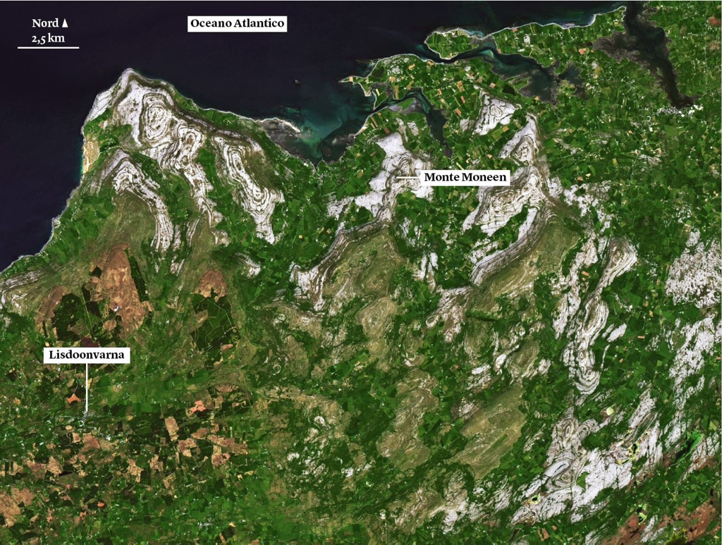 Le pieghe degli strati e la differenza nel tasso di erosione hanno prodotto l’aspetto a terrazze delle colline del Burren. Anche i ghiacciai hanno svolto un ruolo, rimuovendo i sedimenti e arrotondando i rilievi. La roccia calcarea è soggetta all’alterazione chimica che produce il carsismo, dando luogo a un paesaggio irregolare punteggiato da doline, caverne e fessure. In questi solchi si accumula il suolo, permettendo alla vegetazione di crescere in un paesaggio altrimenti spoglio. Tra le piante più diffuse c’è lo shamrock, il trifoglio che è diventato un simbolo dell’Irlanda. Con un po’ di fortuna si potrebbe trovarlo anche sul monte Moneen, una collina a forma di trifoglio alta 262 metri. –Nasa
