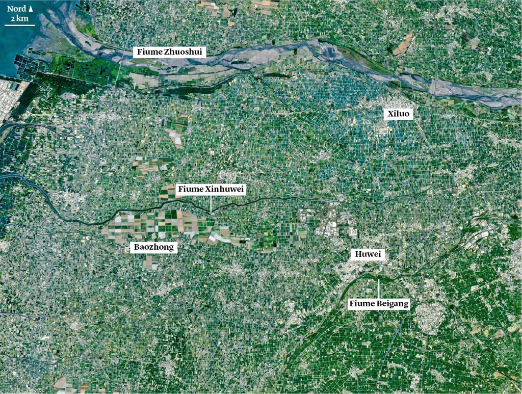 Il blu degli appezzamenti intorno a Xiluo è dovuto alle reti usate per proteggere colture delicate, come ortaggi, frutta e fiori, dal sole, dal caldo, dalle forti piogge e dai parassiti. Il colore di questa zona contrasta con il verde scuro di quella in basso a destra, coltivata soprattutto a riso.–Nasa