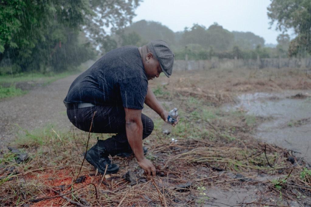 Cecilia Ngu è voluta andare a Cachimbo per rispettare una tradizione camerunese: quando sarà possibile, vorrebbe seppellire il fratello nella terra in cui è nato con un pugno di terra del luogo in cui è morto. Un temporale ci ha impedito di andare oltre Ixhuatán. Cecilia ha dovuto accontentarsi di prendere un po’ di terra bagnata del paese più vicino al luogo in cui il fratello ha perso la vita.