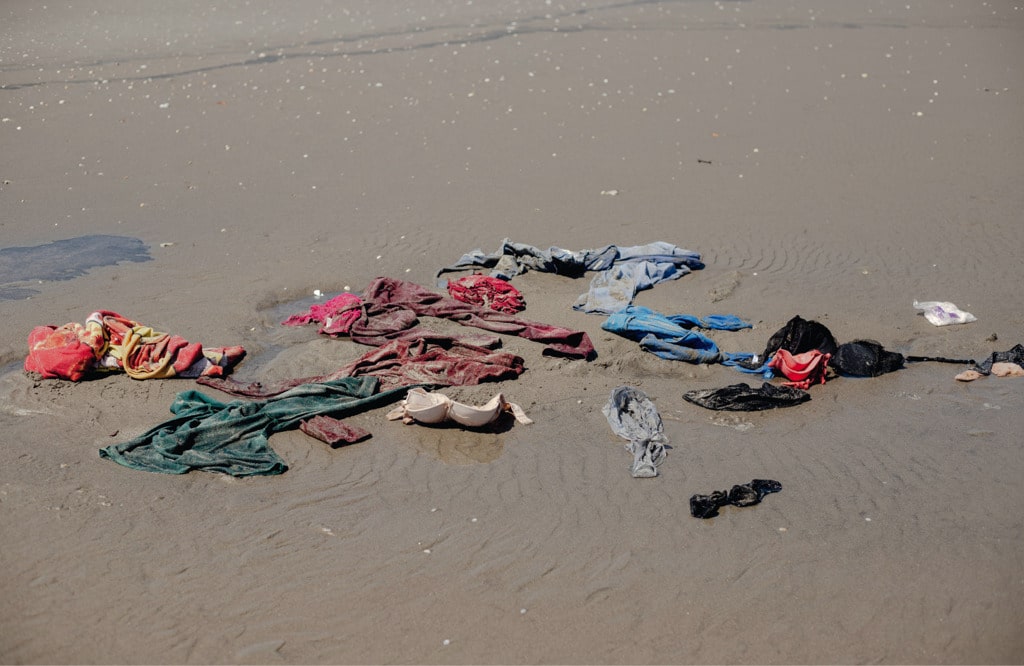 Sulla sabbia c’erano ancora dei vestiti, l’unica prova del naufragio. Ho preso appunti sul mio quaderno: un paio di pantaloni da donna; due abiti; un calzino marrone; una saponetta; un maglione; un altro paio di pantaloni da donna; un sandalo di plastica; un pantaloncino da bambino accanto a una maglietta nera della stessa taglia; una maglia rossa, da adulto; un pacco di assorbenti; un sacchetto di plastica pieno di chicchi bianchi simili al sale grosso, con indicazioni mediche scritte in francese; un flacone di sapone liquido; tre mutande da donna, una rossa, una rosa e una azzurra; un pacchetto di cotone idrofilo; un calzino rosa; due reggiseni, uno nero e uno rosa; due mutande nere; un pantaloncino turchese; due jeans da bambini; una maglietta rosa accanto a un paio di pantaloni e a un asciugamano dello stesso colore; un reggiseno malva; un jeans ocra; un reggiseno verde; una coperta con cuori rossi e gialli; una bottiglia di plastica verde; una maglietta grigia da bambina e un paio di jeans alla rovescia, strappati; una maglietta nera con una stampa bianca della torre Eiffel; una maglia termica da bambino. Le autorità messicane hanno detto che tutti i sopravvissuti erano adulti. Questo è quello che ho visto io.
