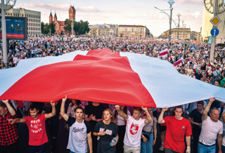 I manifestanti sventolano la vecchia bandiera della Bielorussia (in uso nel 1918 e tra il 1991 e il 1995) durante il corteo del 16 agosto a Minsk contro il presidente Aleksandr Lukašenko. È stata la più grande manifestazione nella storia del paese. Le proteste nell’ex stato sovietico sono cominciate subito dopo le elezioni presidenziali del 9 agosto e l’annuncio della vittoria di Lukašenko con l’80 per cento dei voti. Le mobilitazioni e gli scioperi sono continuati anche nei giorni successivi, mettendo in crisi la tenuta del regime del presidente bielorusso, al potere dal 1994.