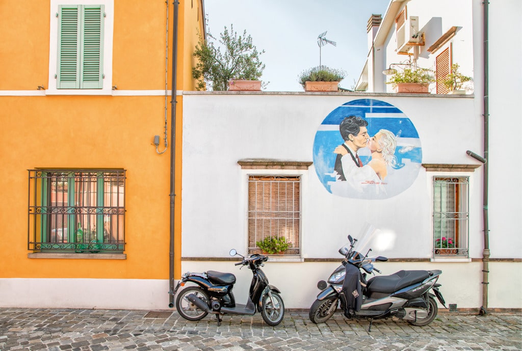 Tre martiri, trovo la piccola cappella rinascimentale di Sant’Antonio, con la sua cupola verde. È qui che l’adolescente Fellini e i suoi amici guardavano le donne che pregavano prima di salire sulle loro biciclette, mentre “i musi appuntiti delle selle scolpivano e gonfiavano i più bei sederoni di tutta la Romagna” . Una scena ricreata in Amarcord. Rimini è ancora oggi una città dove molte persone si muovono in bicicletta.
