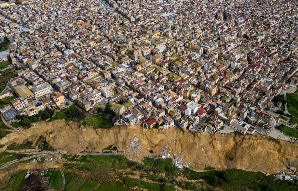 Da giorni i 25mila abitanti della cittadina siciliana di Niscemi vivono sull’orlo di un baratro profondo 25 metri. Il 25 gennaio, a causa delle piogge torrenziali portate dal ciclone Harry, un’enorme frana ha cancellato un intero pendio del centro abitato, aprendo un precipizio lungo quattro chilometri. Strade crollate e auto inghiottite dal fango. Intere parti del centro abitato sono sprofondate nella valle sottostante. Al momento decine di case sono pericolosamente sospese sul bordo della frana. Ora dopo ora veicoli e frammenti d’asfalto scivolano a valle a causa del terreno instabile. Finora le autorità hanno evacuato più di 1.600 persone. Interi quartieri del centro storico sono a rischio, comprese alcune chiese del diciassettesimo secolo che potrebbero crollare da un momento all’altro.