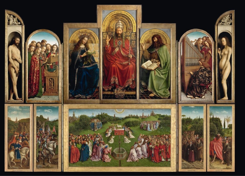 Non ci è rimasto nessun dipinto di Hubert per verificare l’affermazione, ma il lavoro di Jan van Eyck al polittico, terminato nel 1432, ha ridefinito l’arte raggiungendo la fama immediata. L’opera, che contiene L’adorazione dell’agnello mistico, un simulacro di Cristo, presenta una serie di primi assoluti in campo artistico: i primi interni raffigurati realisticamente, il primo autentico paesaggio, la prima vera e propria veduta cittadina, i primi nudi, i primi vividi ritratti rinascimentali. Van Eyck portò la pittura a olio a livelli di raffinatezza inediti – con velature e giochi di trasparenza che creano profondità ed effetti di luce mai visti prima – per adeguarla alla sua straordinaria capacità di osservazione. Vasari lo ammirava, Dürer andò in pellegrinaggio a Gand solo per vedere il dipinto.