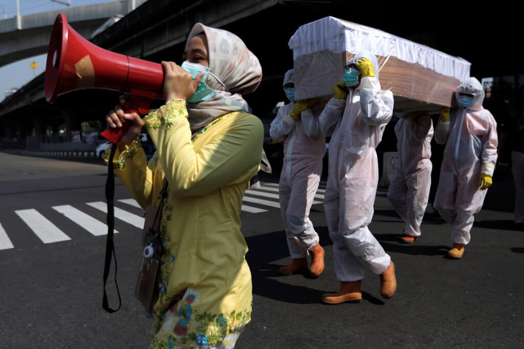 - Le autorità indonesiane stanno tentando nuovi tipi di terapie d’urto per attirare l’attenzione della popolazione del paese con più alto numero di morti nel sudest asiatico. Ogni giorno a Jakarta, alle 9 in punto, alcuni funzionari del governo locale indossano i dispositivi di protezione, sollevano una bara di legno vuota sulle spalle e si mettono in cammino per le strade trafficate della città.