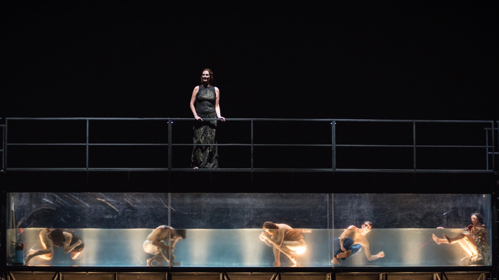 Secondo l’uso barocco, l’opera si apre con un prologo in cui gli dei, accompagnati da divinità marine, presentano al pubblico l’argomento dell’opera in termini simbolici. Sasha Waltz mette al centro della scena una grande vasca, un acquario in cui i movimenti dei danzatori ricordano i fregi dei sarcofaghi antichi. Festose divinità marine, simbolo di vita, che decorano una tomba, a ricordarci che il grande amore di cui ci apprestiamo a seguire le vicende finirà con un corpo morto in scena, quello della sventurata Didone. Il primo atto, quello in cui veniamo messi a conoscenza dell’amore tra Didone ed Enea, è sensuale e carnevalesco. Le danze e i cori pastorali di Purcell si trasformano in uno scollacciato carnasciale, con danze gioiose e un lungo intermezzo comico che è forse la parte meno a fuoco dello spettacolo.