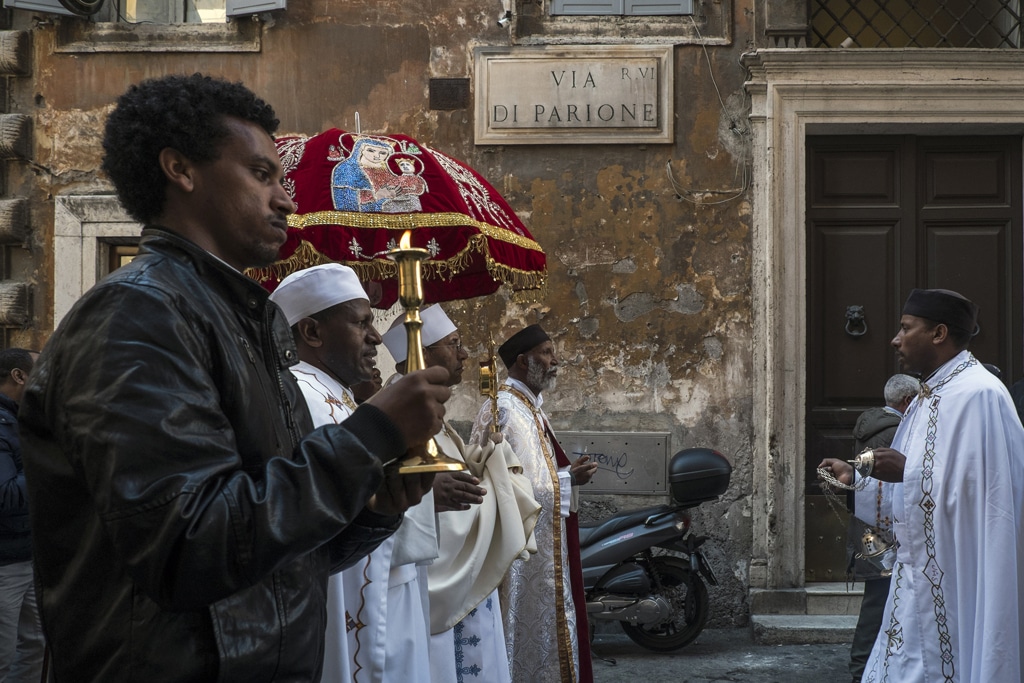 Seguo il gruppo di donne alla chiesa di San Tommaso in Parione, nella via omonima, alle spalle di Piazza Navona. La chiesa è cattolica di rito alessandrino. La messa lunghissima, intensa e piena di momenti rituali. La gente canta quasi in trance, alcuni momenti si svolgono sotto un ombrello riccamente adornato. Gli uomini sono tutti assiepati sulla navata sinistra, le donne esattamente dall’altro lato. E dopo la messa la gioia esplode. Gli eritrei e le eritree prendono per un attimo possesso del centro di Roma. Un ragazzo vestito di bianco con una croce viene posto alla testa del corteo colorato. Dietro di lui donne e uomini con tamburi e tamburelli cantano, suonano e si agitano. È allora che mi ricordo delle scene del film di Gianfranco Pannone, in fondo Asmara non è così tanto diversa da Catania, Napoli, Torino, Campobasso. Stessa devozione, stessa felicità. I turisti scattano foto, i romani applaudono. Al centro del corteo alcune donne tengono in alto dipinti della Madonna, in alcuni Maria è bianca come il latte, in altri invece è orgogliosamente nera. Si intrecciano generazioni. Nonne, madri, nipoti. Le nonne hanno fatto le badanti nelle case degli italiani, le mamme hanno cercato di arrangiarsi alla bell’e meglio, i figli ora vogliono riscattare il passato, studiare, stare bene, sognare. Ma per il momento si sogna solo di riempire la pancia. Una signora me lo dice all’orecchio: abbiamo preparato l’injera e lo zighinì, vieni a via Dandolo ce n’è per tutti.