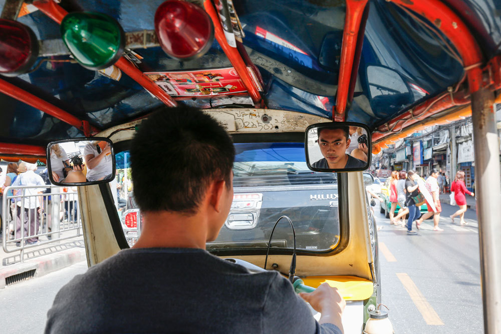 Sono dentro un tuk-tuk. Il guidatore deve aver sbagliato carriera e desidera a ogni costo dimostrarci di avere un potenziale da campione mondiale di motociclismo e che potrebbe rappresentare con successo la Thailandia in una qualsiasi competizione di motori.