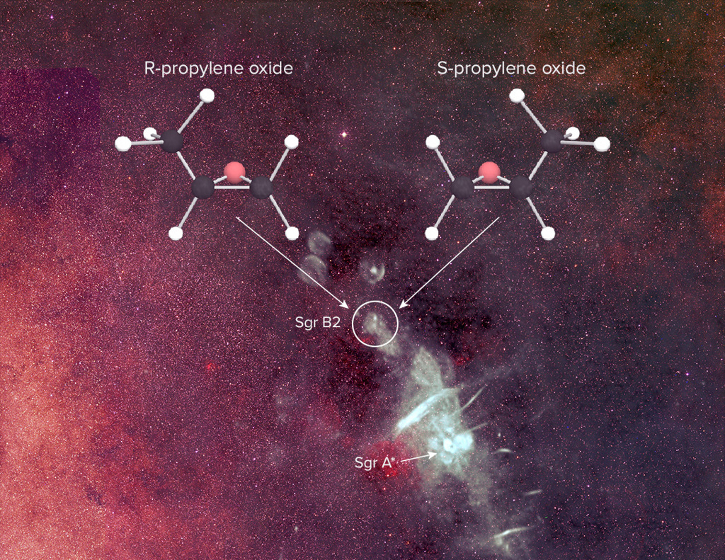 Una possibile risposta potrebbe venire da questo studio di Brett McGuire e colleghi, pubblicato sulla rivista Science. I ricercatori hanno individuato molecole di ossido di propilene vicino al centro della nostra galassia, nella nube di polvere e gas chiamata Sagittarius B2, una regione dove si formano le stelle. L’ossido di propilene è una molecola chirale, con una forma destra e una sinistra. Il team non ha però ancora chiarito quale forma sia più abbondante nello spazio interstellare o se siano presenti in parti uguali. Una lieve preferenza per un tipo di molecola nello spazio potrebbe aiutare a spiegare l’abbondanza di un particolare tipo sul nostro pianeta e quindi una caratteristica dei sistemi biologici.