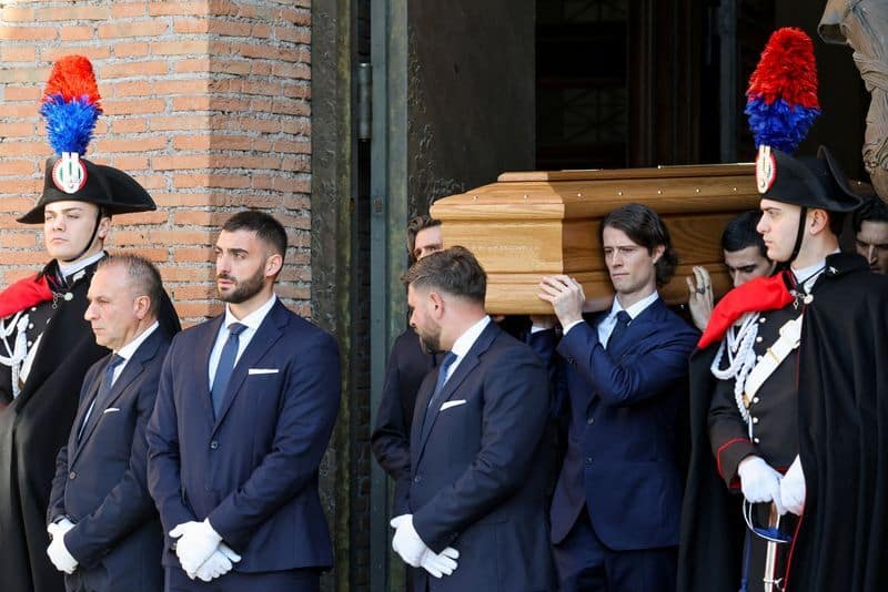Valentino’s co-founder Giancarlo Giammetti, dressed in a sharply tailored black satin suit, and the designer’s last partner, Bruce Hoeksema, accompanied the plain wooden coffin as it entered the church, drawing applause from the crowds outside.