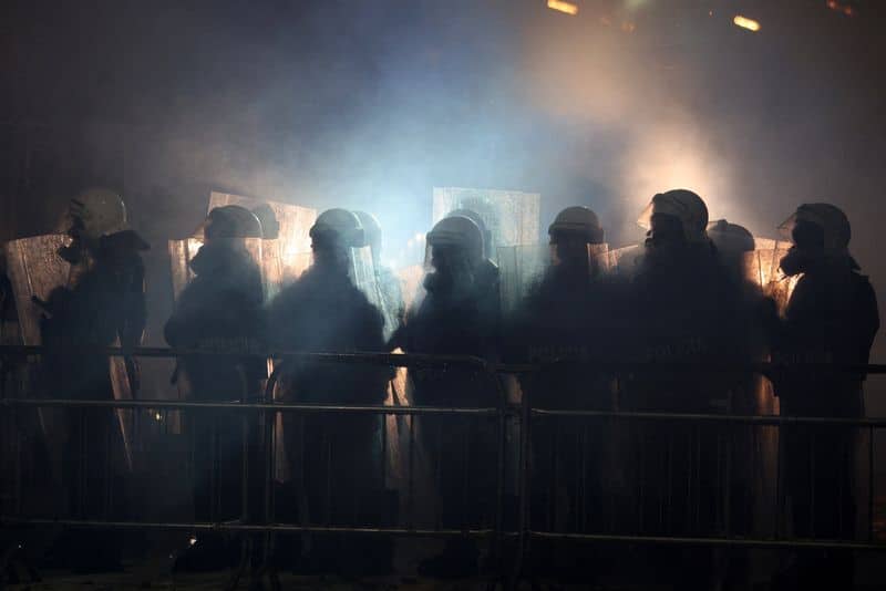 Protesters have thrown petrol bombs, and police and demonstrators have been injured.